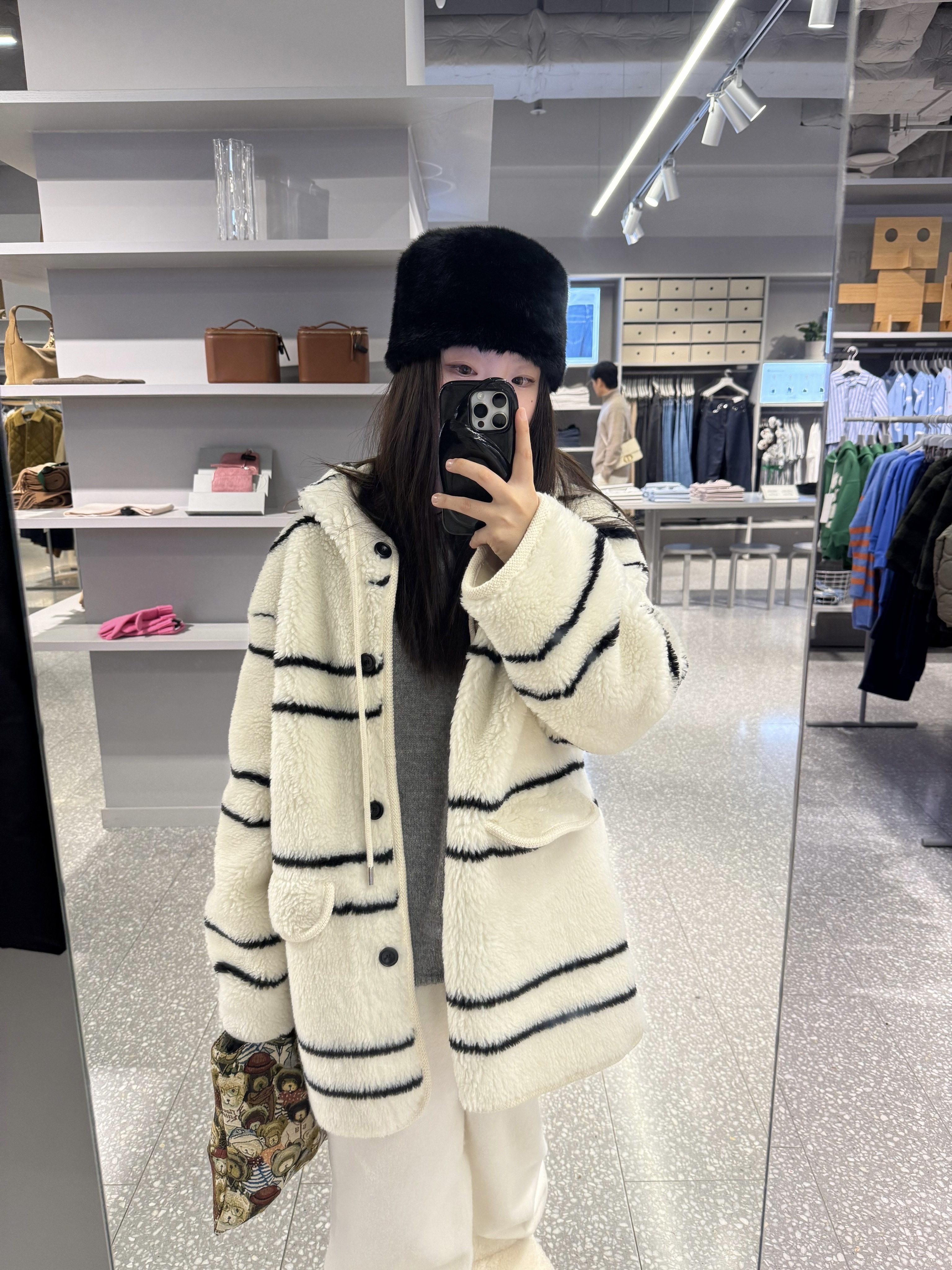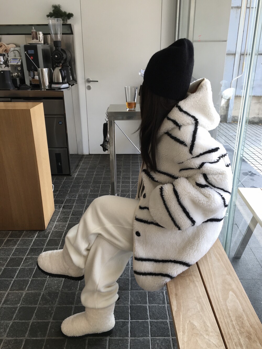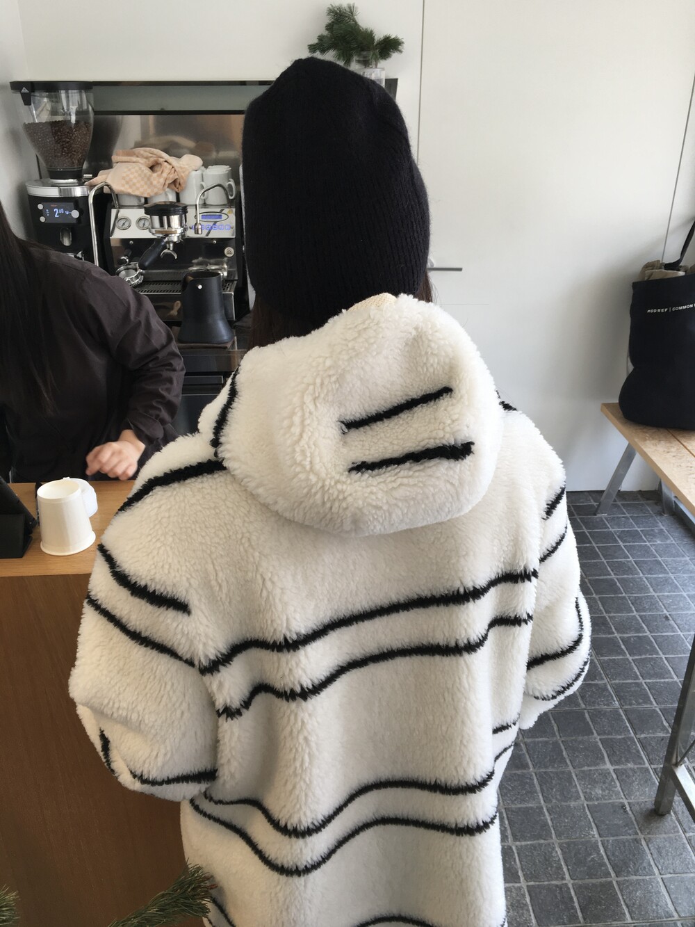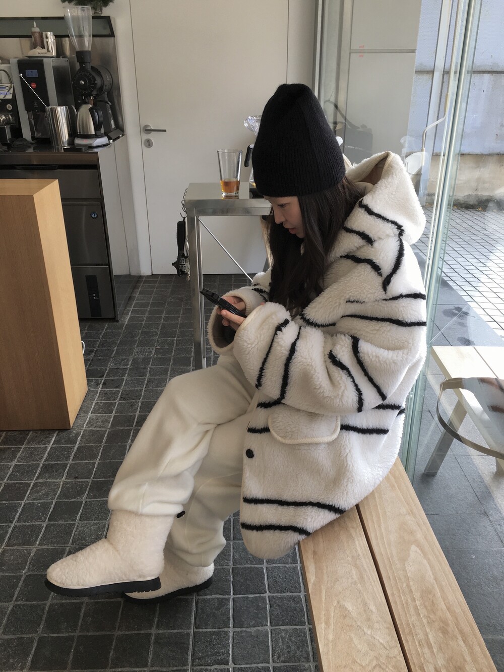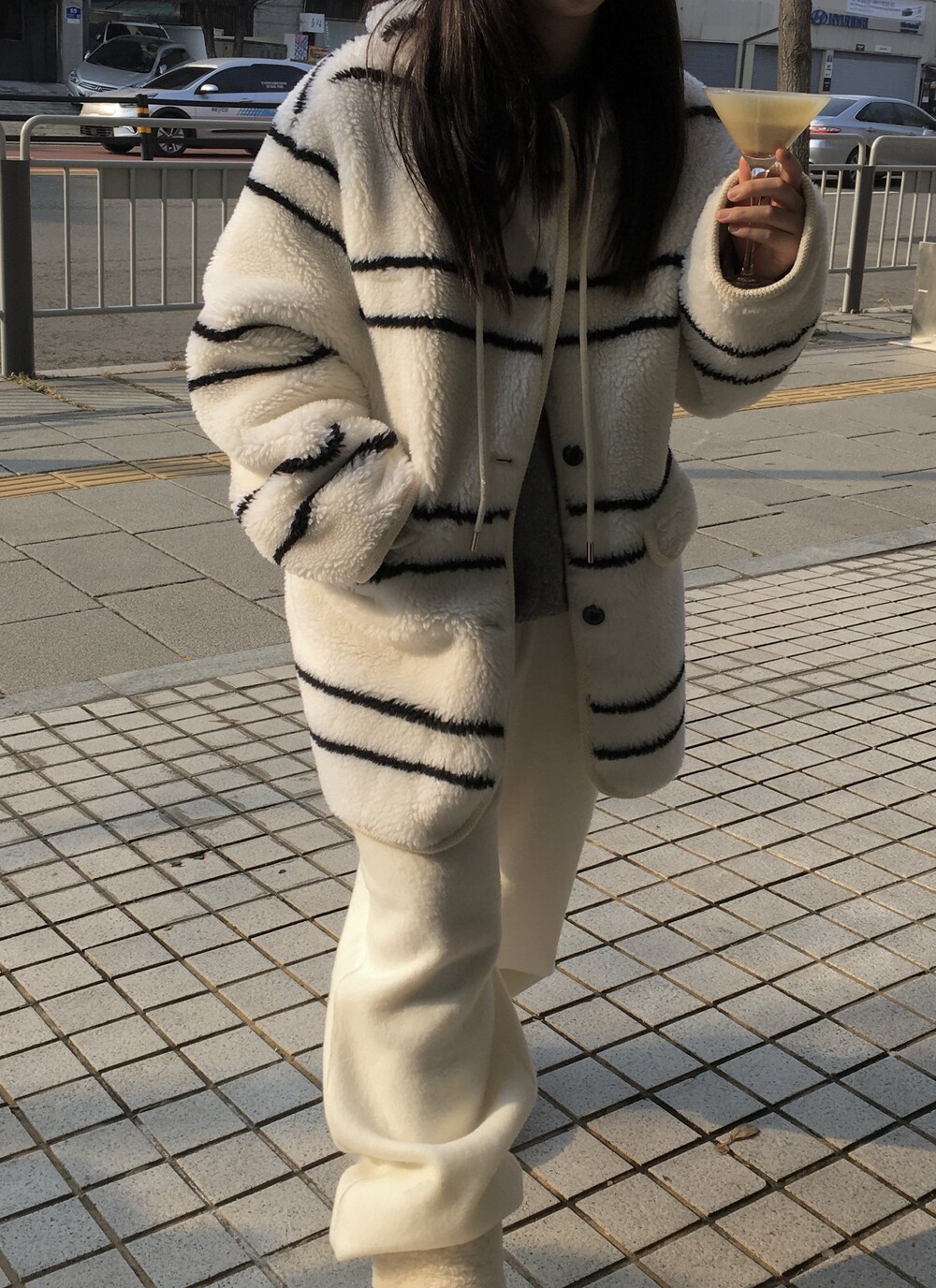 스트라이프 후드 무스탕
